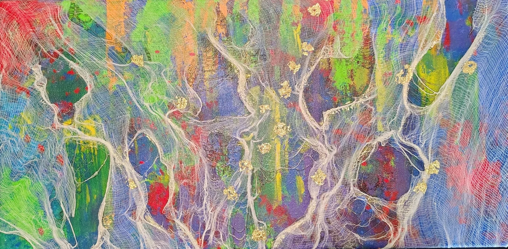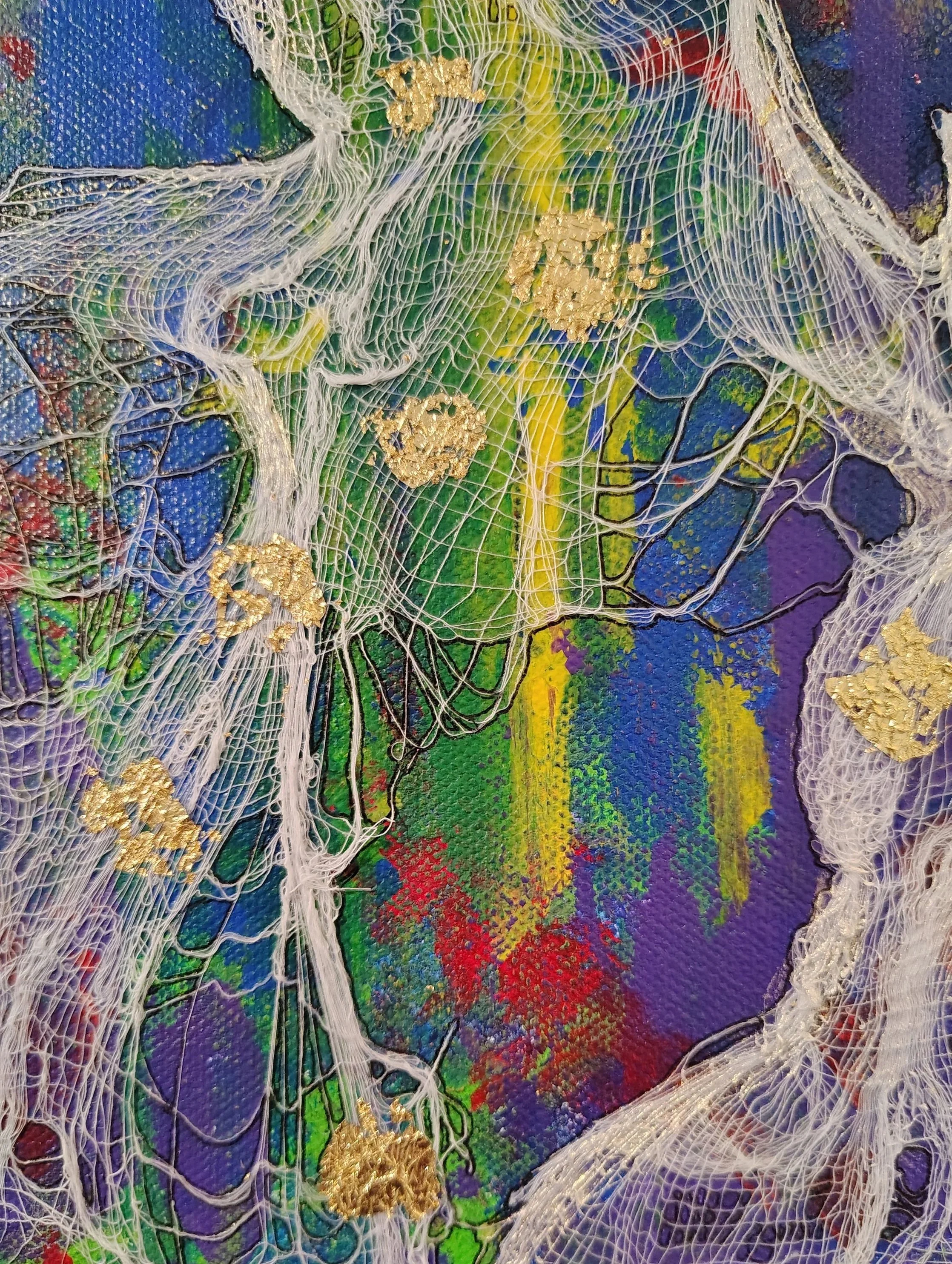 Materials: Acrylic, ink, cheesecloth, gold leaf on canvas